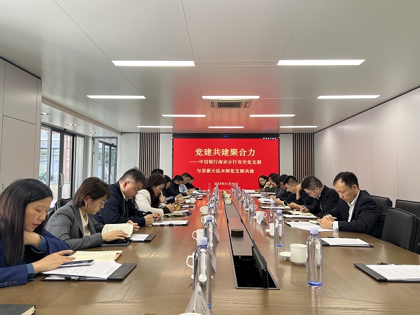 為深入學(xué)習(xí)貫徹習(xí)近平新時代中國特色社會主義思想,全面落實新時代黨的建設(shè)總要求,推動黨建工作與經(jīng)營發(fā)展深度融合,11月10日下午,蘇豪天泓本部黨支部與中信銀行南京分行交易銀行部黨支部、月牙湖支行黨支部、黨群工作部黨支部在蘇豪天泓東麒路汽車園區(qū)開展共建活動。蘇豪天泓部分黨委領(lǐng)導(dǎo)班子成員、支委及黨員代表、中層干部,中信銀行南京分行有關(guān)黨支部書記、支委及黨員代表參加活動。